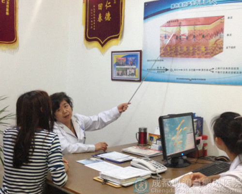 在给患者仔细查看病情后,吴占琴医生还耐心为患者讲解白癜风的形成原因