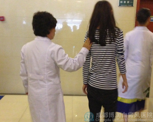 初诊的白癜风患者在吴占琴医生和医助的陪同下,做了相应的检查